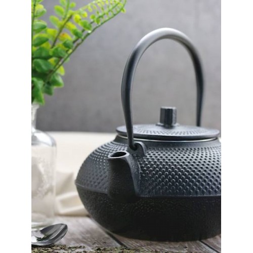 Juodas, ketaus arbatinukas su rankena.